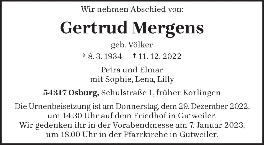 Hier finden Sie alle Traueranzeigen aus der Zeitung, die bisher für Gertrud Mergens erschienen sind. Weitere Traueranzeigen, die in der Zeitung erscheinen, werden hier ebenfalls aufgelistet