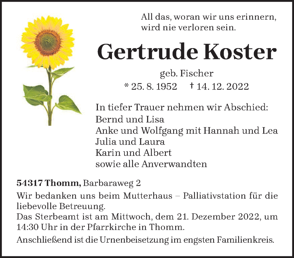 Hier finden Sie alle Traueranzeigen aus der Zeitung, die bisher für Gertrude Koster erschienen sind. Weitere Traueranzeigen, die in der Zeitung erscheinen, werden hier ebenfalls aufgelistet
