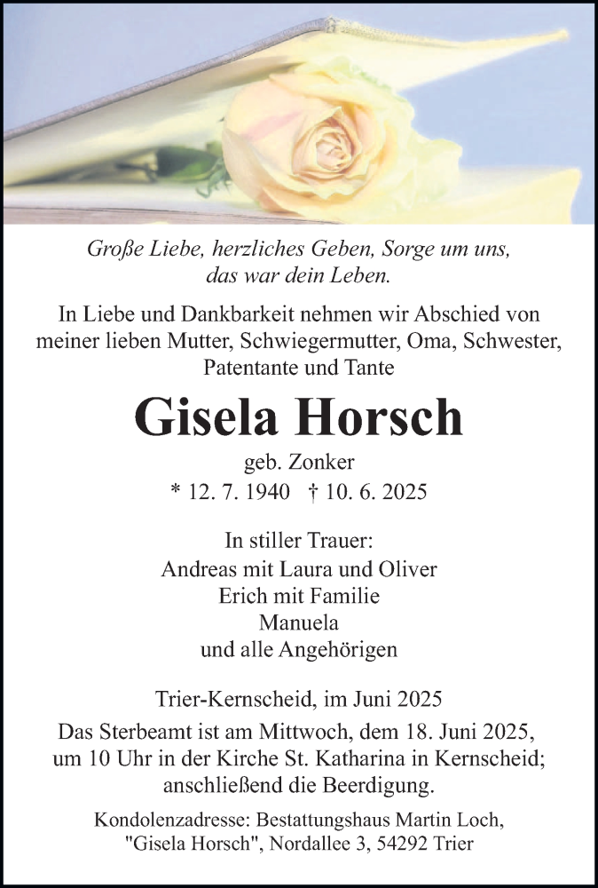 Hier finden Sie alle Traueranzeigen aus der Zeitung, die bisher für Gisela Horsch erschienen sind. Weitere Traueranzeigen, die in der Zeitung erscheinen, werden hier ebenfalls aufgelistet