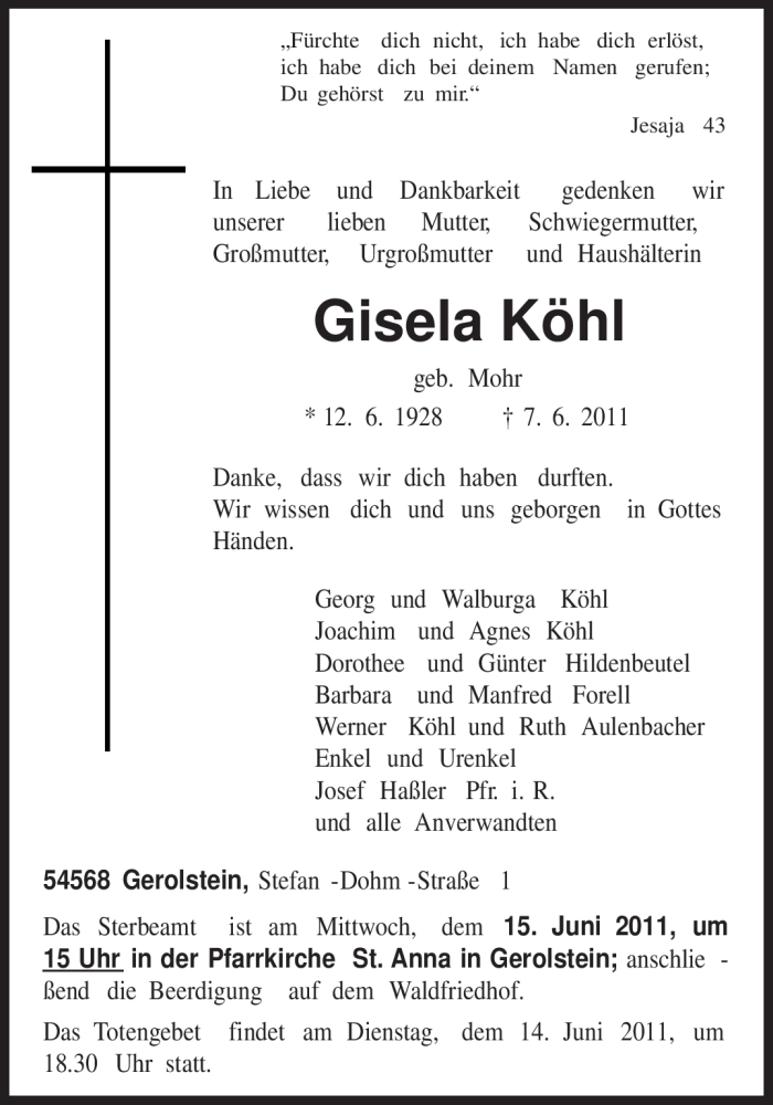 Hier finden Sie alle Traueranzeigen aus der Zeitung, die bisher für Gisela Köhl erschienen sind. Weitere Traueranzeigen, die in der Zeitung erscheinen, werden hier ebenfalls aufgelistet