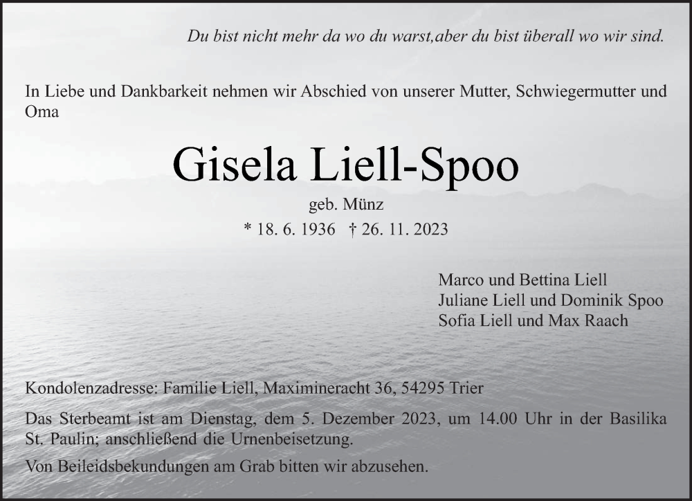 Hier finden Sie alle Traueranzeigen aus der Zeitung, die bisher für Gisela Liell-Spoo erschienen sind. Weitere Traueranzeigen, die in der Zeitung erscheinen, werden hier ebenfalls aufgelistet