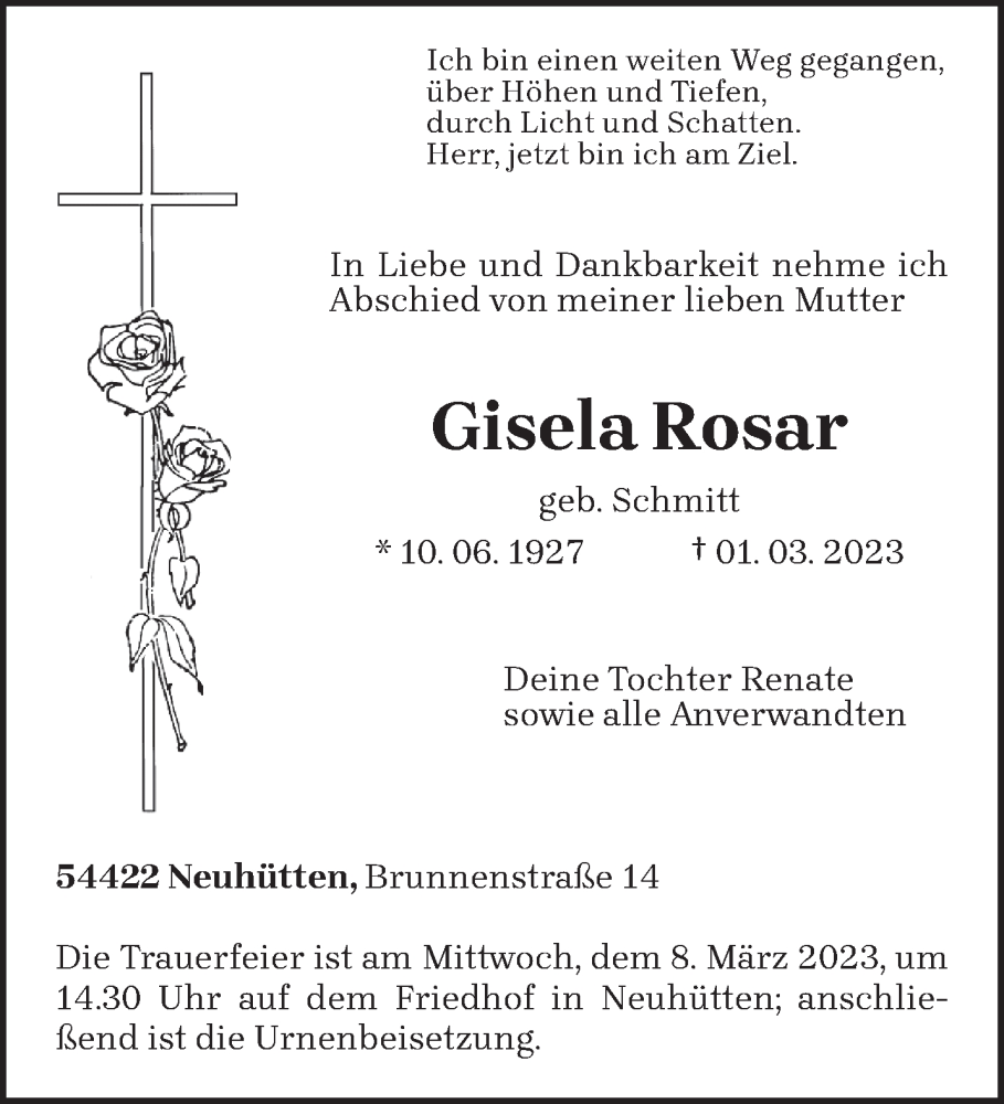 Hier finden Sie alle Traueranzeigen aus der Zeitung, die bisher für Gisela Rosar erschienen sind. Weitere Traueranzeigen, die in der Zeitung erscheinen, werden hier ebenfalls aufgelistet