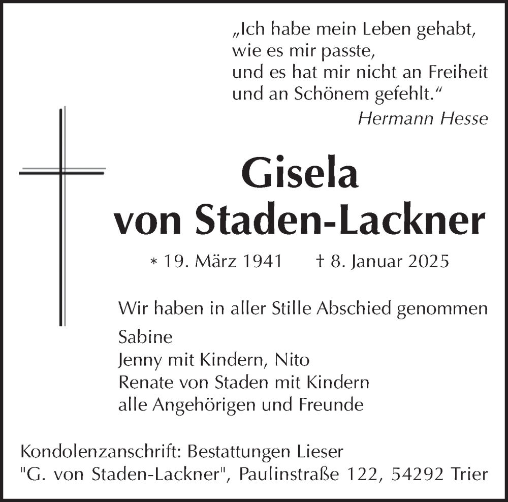 Hier finden Sie alle Traueranzeigen aus der Zeitung, die bisher für Gisela von Staden-Lackner erschienen sind. Weitere Traueranzeigen, die in der Zeitung erscheinen, werden hier ebenfalls aufgelistet