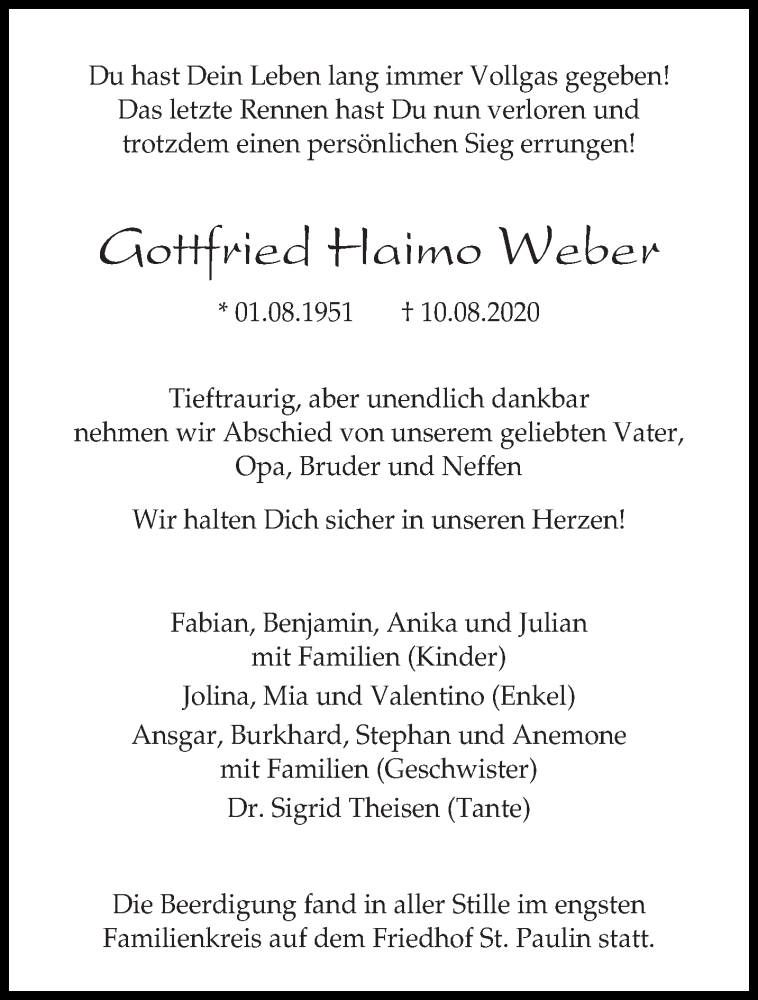 Hier finden Sie alle Traueranzeigen aus der Zeitung, die bisher für Gottfried Haimo Weber erschienen sind. Weitere Traueranzeigen, die in der Zeitung erscheinen, werden hier ebenfalls aufgelistet