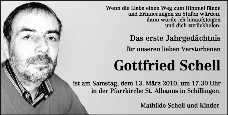 Hier finden Sie alle Traueranzeigen aus der Zeitung, die bisher für Gottfried Schell erschienen sind. Weitere Traueranzeigen, die in der Zeitung erscheinen, werden hier ebenfalls aufgelistet