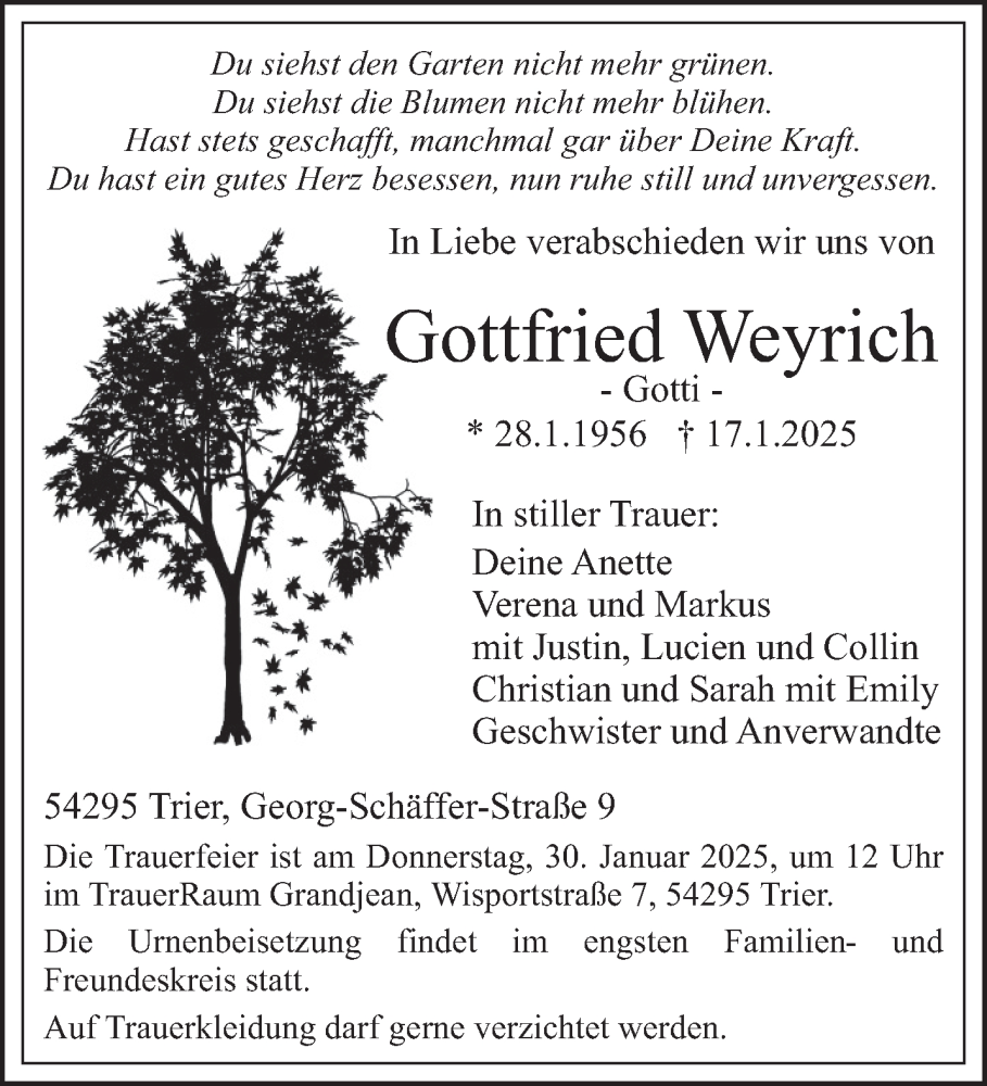 Hier finden Sie alle Traueranzeigen aus der Zeitung, die bisher für Gottfried Weyrich erschienen sind. Weitere Traueranzeigen, die in der Zeitung erscheinen, werden hier ebenfalls aufgelistet