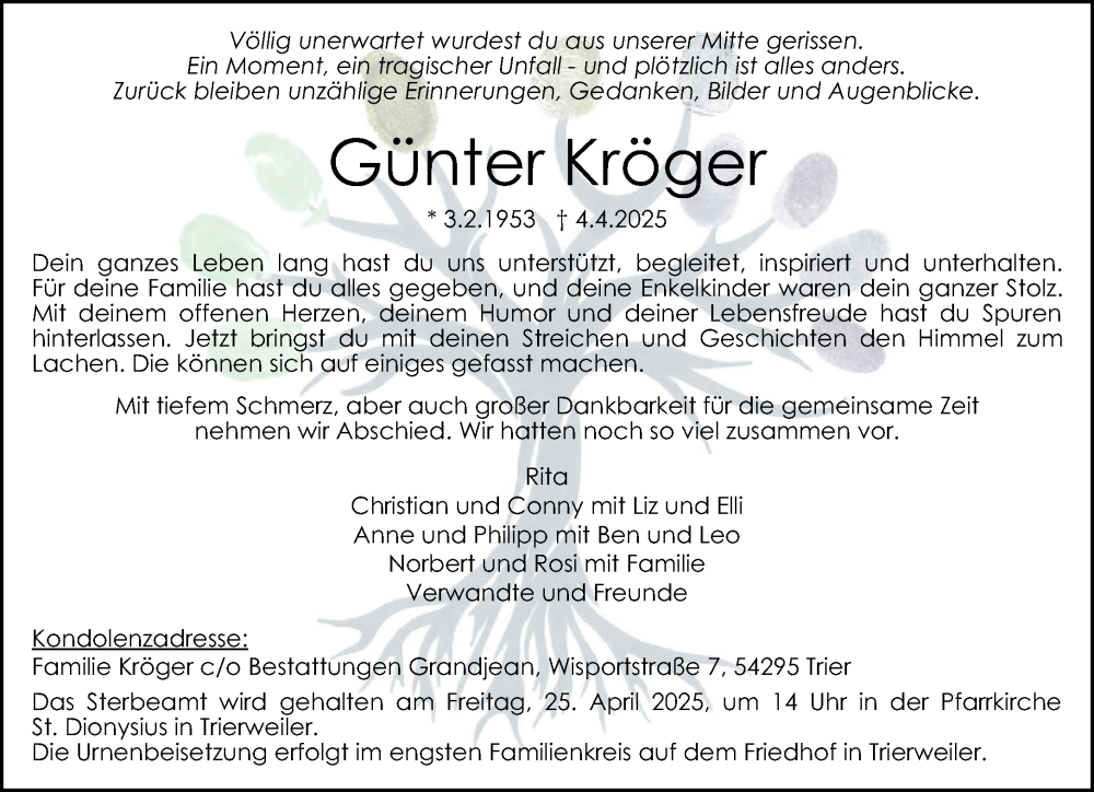 Hier finden Sie alle Traueranzeigen aus der Zeitung, die bisher für Günter Kröger erschienen sind. Weitere Traueranzeigen, die in der Zeitung erscheinen, werden hier ebenfalls aufgelistet