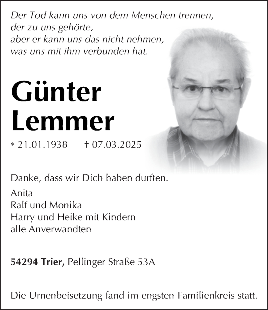 Hier finden Sie alle Traueranzeigen aus der Zeitung, die bisher für Günter Lemmer erschienen sind. Weitere Traueranzeigen, die in der Zeitung erscheinen, werden hier ebenfalls aufgelistet