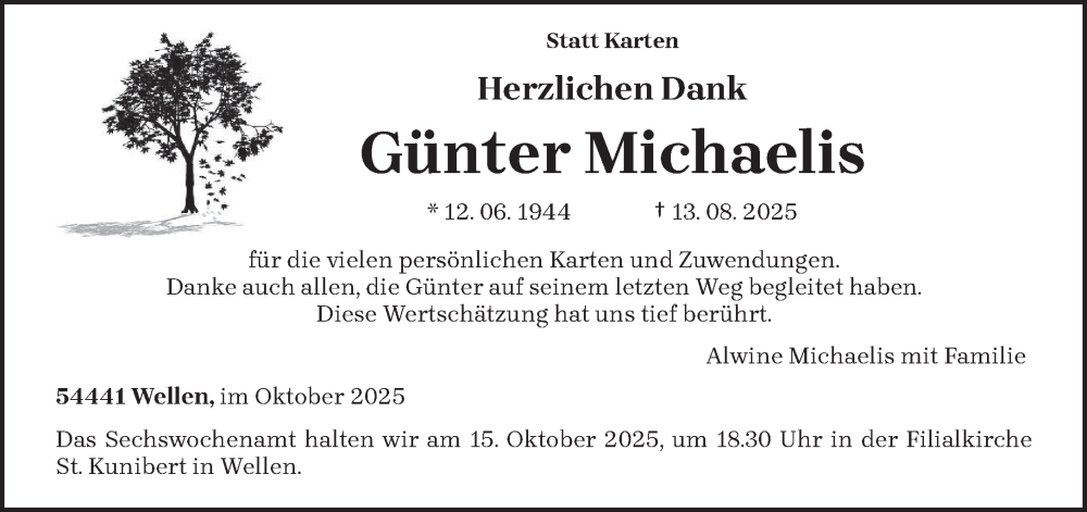 Hier finden Sie alle Traueranzeigen aus der Zeitung, die bisher für Günter Michaelis erschienen sind. Weitere Traueranzeigen, die in der Zeitung erscheinen, werden hier ebenfalls aufgelistet