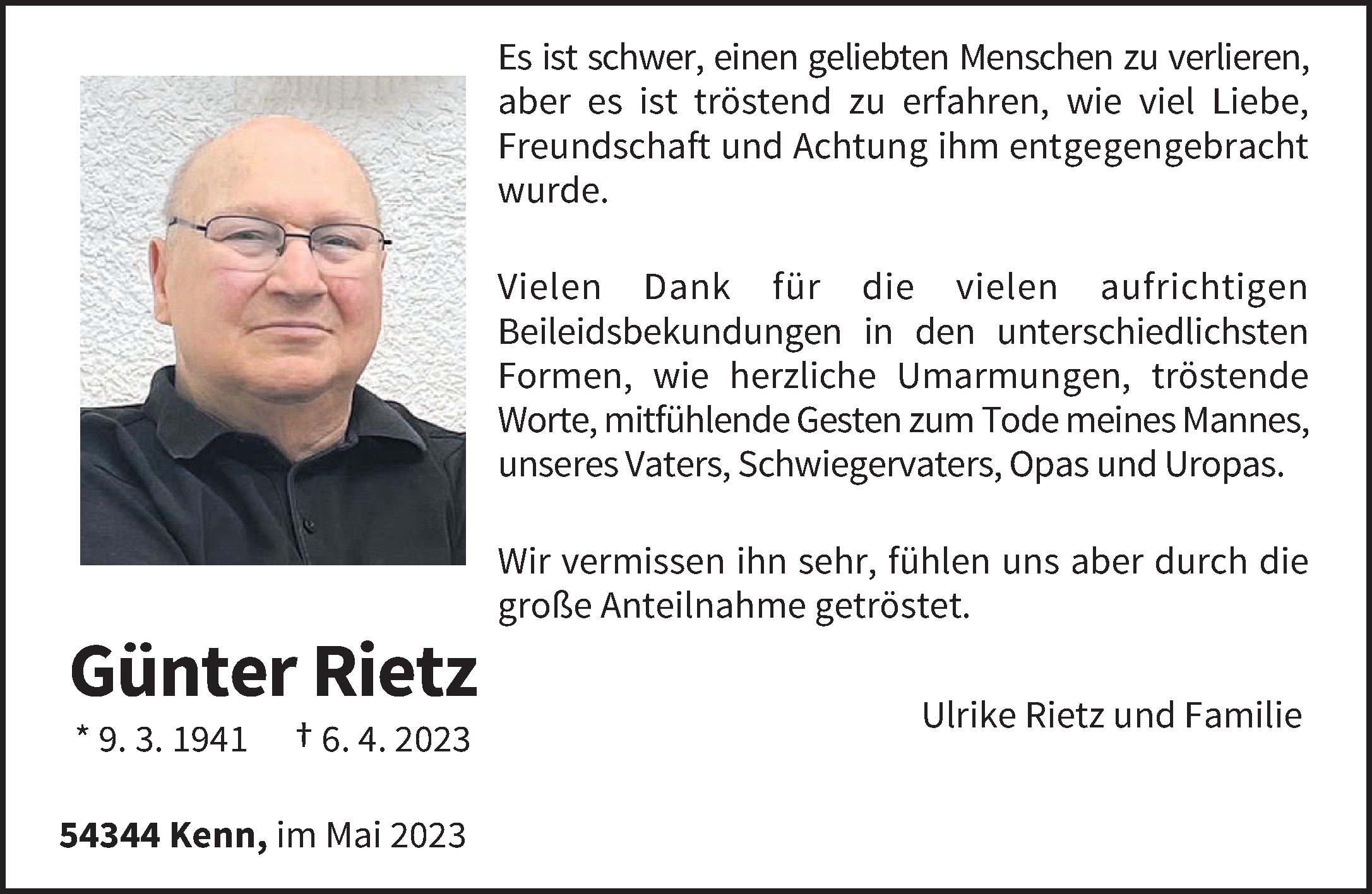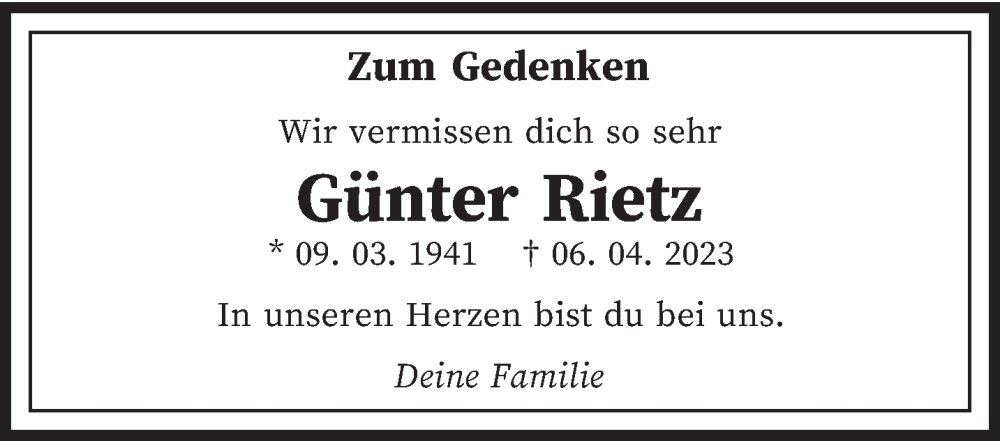 Hier finden Sie alle Traueranzeigen aus der Zeitung, die bisher für Günter Rietz erschienen sind. Weitere Traueranzeigen, die in der Zeitung erscheinen, werden hier ebenfalls aufgelistet