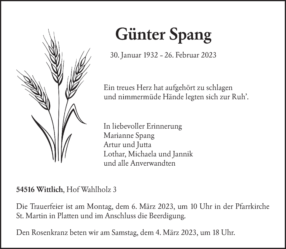 Hier finden Sie alle Traueranzeigen aus der Zeitung, die bisher für Günter Spang erschienen sind. Weitere Traueranzeigen, die in der Zeitung erscheinen, werden hier ebenfalls aufgelistet