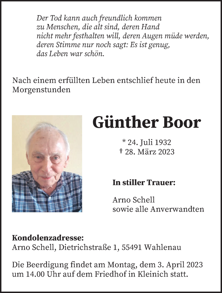 Hier finden Sie alle Traueranzeigen aus der Zeitung, die bisher für Günther Boor erschienen sind. Weitere Traueranzeigen, die in der Zeitung erscheinen, werden hier ebenfalls aufgelistet
