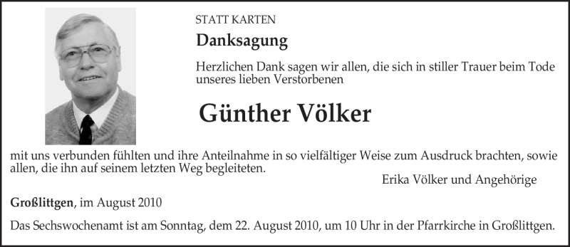 Hier finden Sie alle Traueranzeigen aus der Zeitung, die bisher für Günther Völker erschienen sind. Weitere Traueranzeigen, die in der Zeitung erscheinen, werden hier ebenfalls aufgelistet