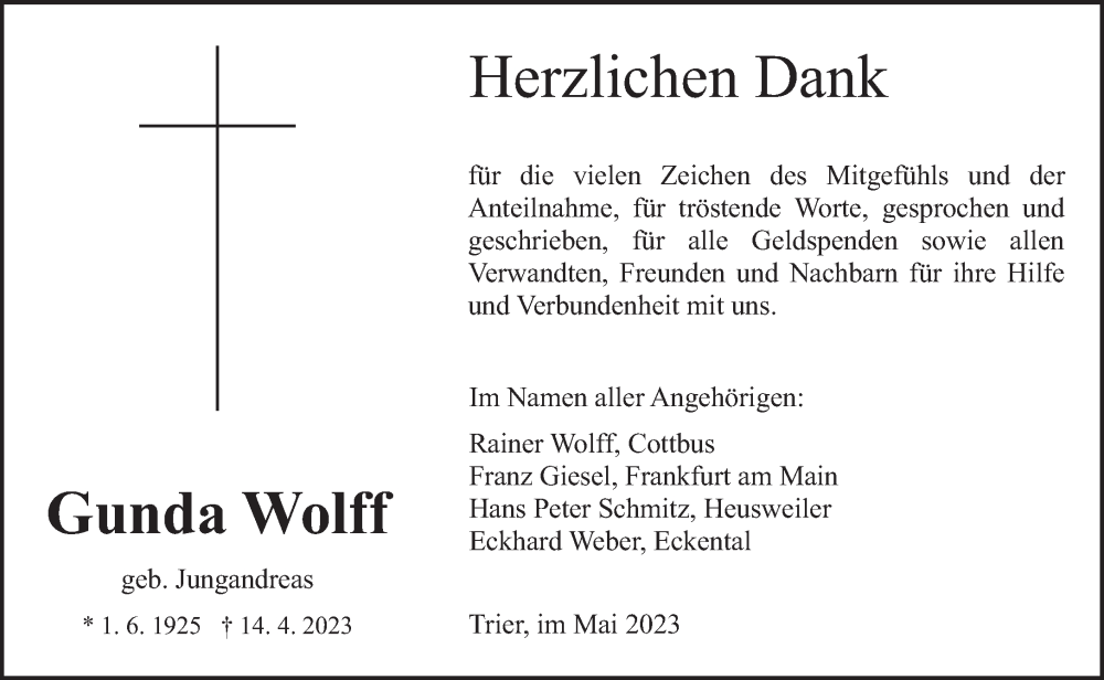 Hier finden Sie alle Traueranzeigen aus der Zeitung, die bisher für Gunda Wolff erschienen sind. Weitere Traueranzeigen, die in der Zeitung erscheinen, werden hier ebenfalls aufgelistet