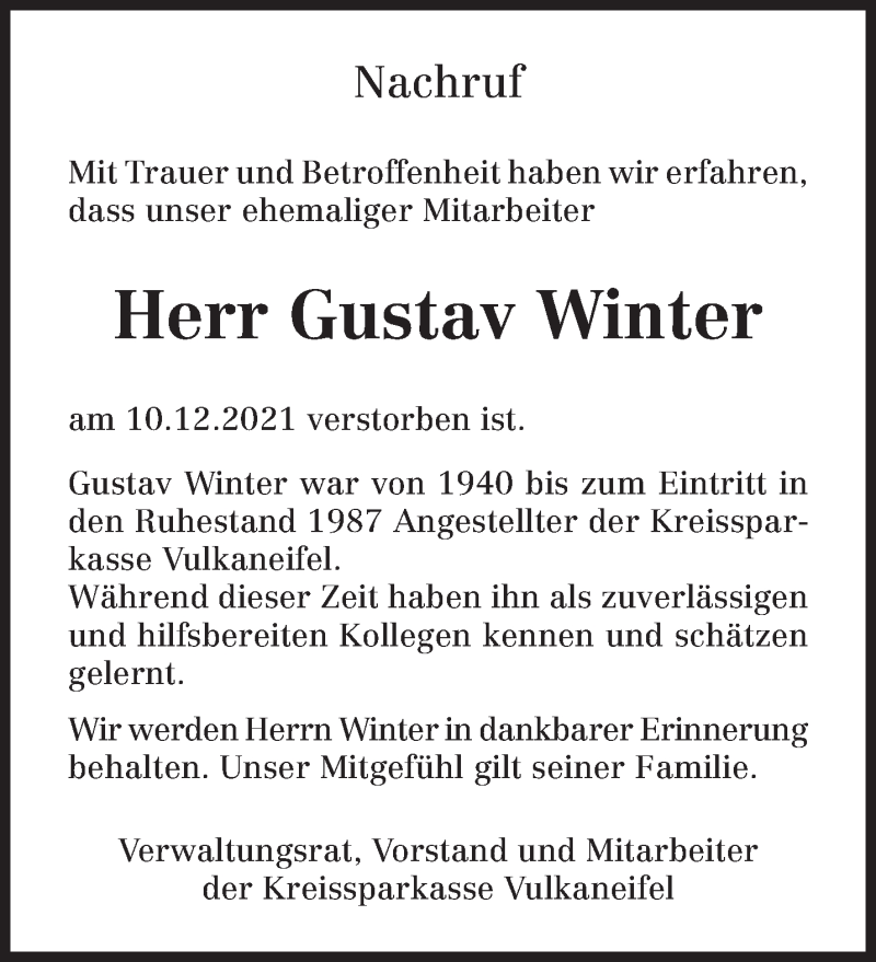 Hier finden Sie alle Traueranzeigen aus der Zeitung, die bisher für Gustav Winter erschienen sind. Weitere Traueranzeigen, die in der Zeitung erscheinen, werden hier ebenfalls aufgelistet