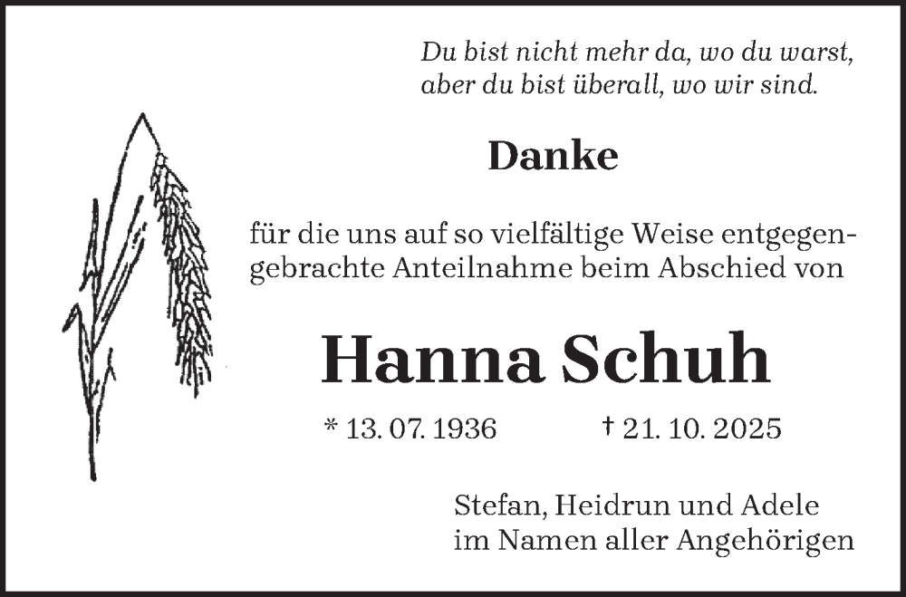 Hier finden Sie alle Traueranzeigen aus der Zeitung, die bisher für Hanna Schuh erschienen sind. Weitere Traueranzeigen, die in der Zeitung erscheinen, werden hier ebenfalls aufgelistet
