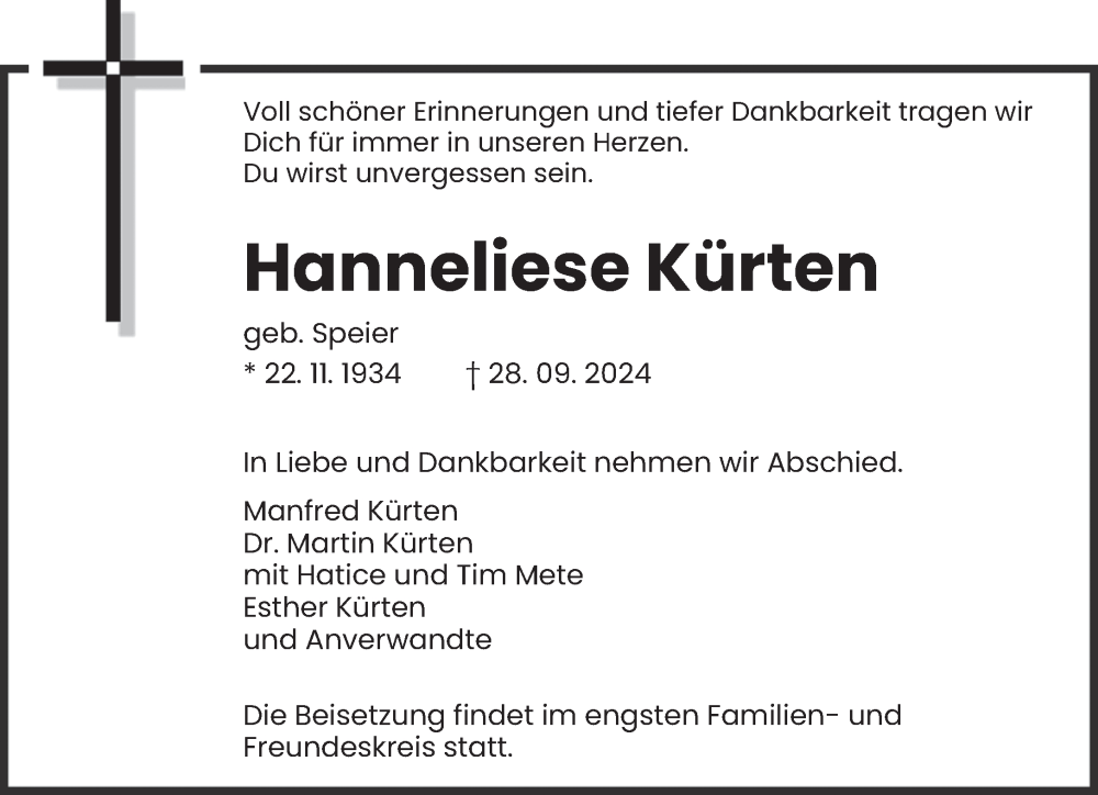 Hier finden Sie alle Traueranzeigen aus der Zeitung, die bisher für Hanneliese Kürten erschienen sind. Weitere Traueranzeigen, die in der Zeitung erscheinen, werden hier ebenfalls aufgelistet