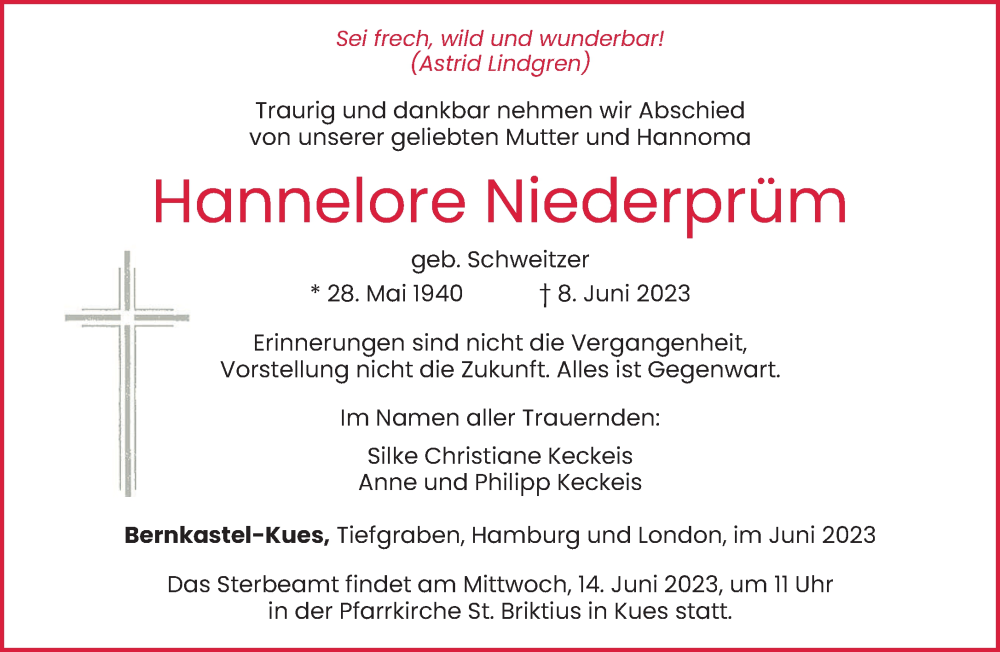Hier finden Sie alle Traueranzeigen aus der Zeitung, die bisher für Hannelore Niederprüm erschienen sind. Weitere Traueranzeigen, die in der Zeitung erscheinen, werden hier ebenfalls aufgelistet