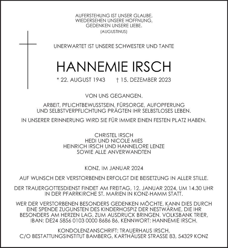 Hier finden Sie alle Traueranzeigen aus der Zeitung, die bisher für Hannemie Irsch erschienen sind. Weitere Traueranzeigen, die in der Zeitung erscheinen, werden hier ebenfalls aufgelistet