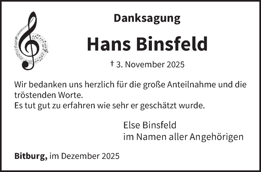 Hier finden Sie alle Traueranzeigen aus der Zeitung, die bisher für Hans Binsfeld erschienen sind. Weitere Traueranzeigen, die in der Zeitung erscheinen, werden hier ebenfalls aufgelistet