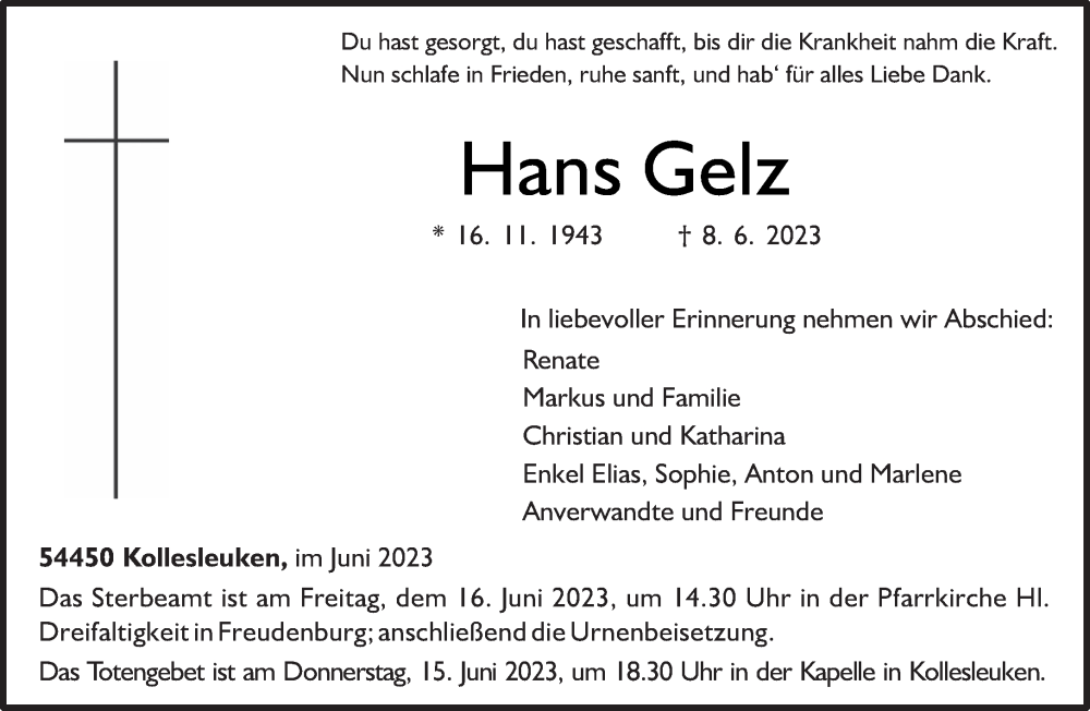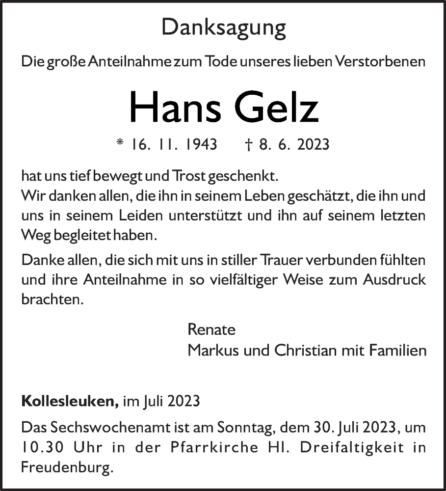 Hier finden Sie alle Traueranzeigen aus der Zeitung, die bisher für Hans Gelz erschienen sind. Weitere Traueranzeigen, die in der Zeitung erscheinen, werden hier ebenfalls aufgelistet