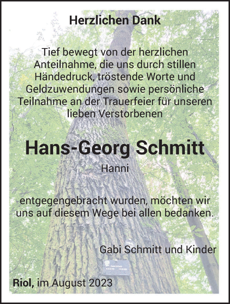 Hier finden Sie alle Traueranzeigen aus der Zeitung, die bisher für Hans-Georg Schmitt erschienen sind. Weitere Traueranzeigen, die in der Zeitung erscheinen, werden hier ebenfalls aufgelistet