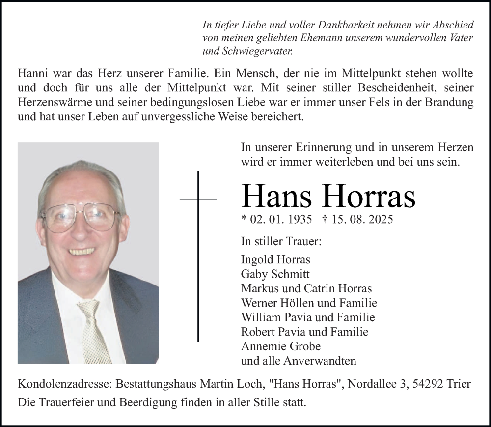 Hier finden Sie alle Traueranzeigen aus der Zeitung, die bisher für Hans Horras erschienen sind. Weitere Traueranzeigen, die in der Zeitung erscheinen, werden hier ebenfalls aufgelistet