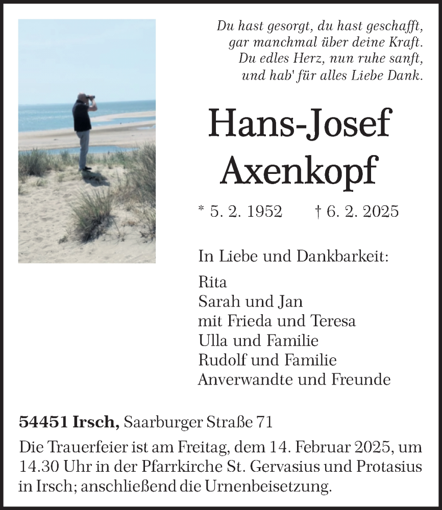 Hier finden Sie alle Traueranzeigen aus der Zeitung, die bisher für Hans-Josef Axenkopf erschienen sind. Weitere Traueranzeigen, die in der Zeitung erscheinen, werden hier ebenfalls aufgelistet