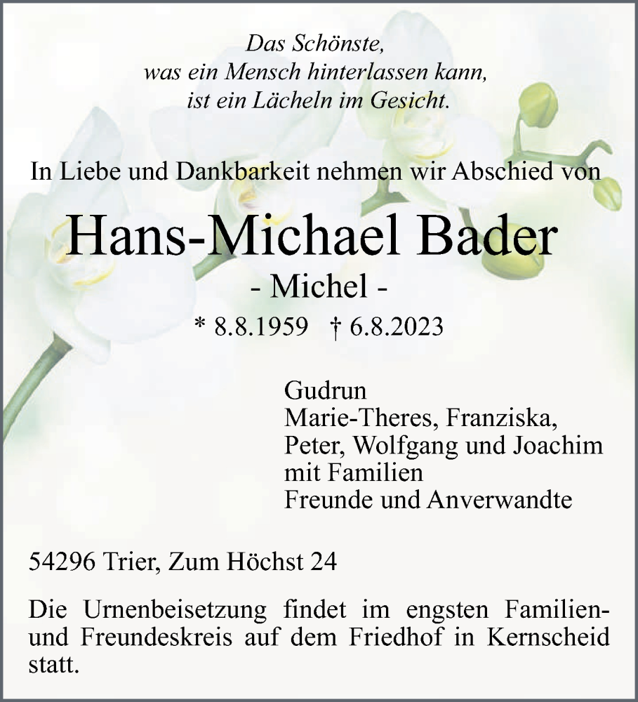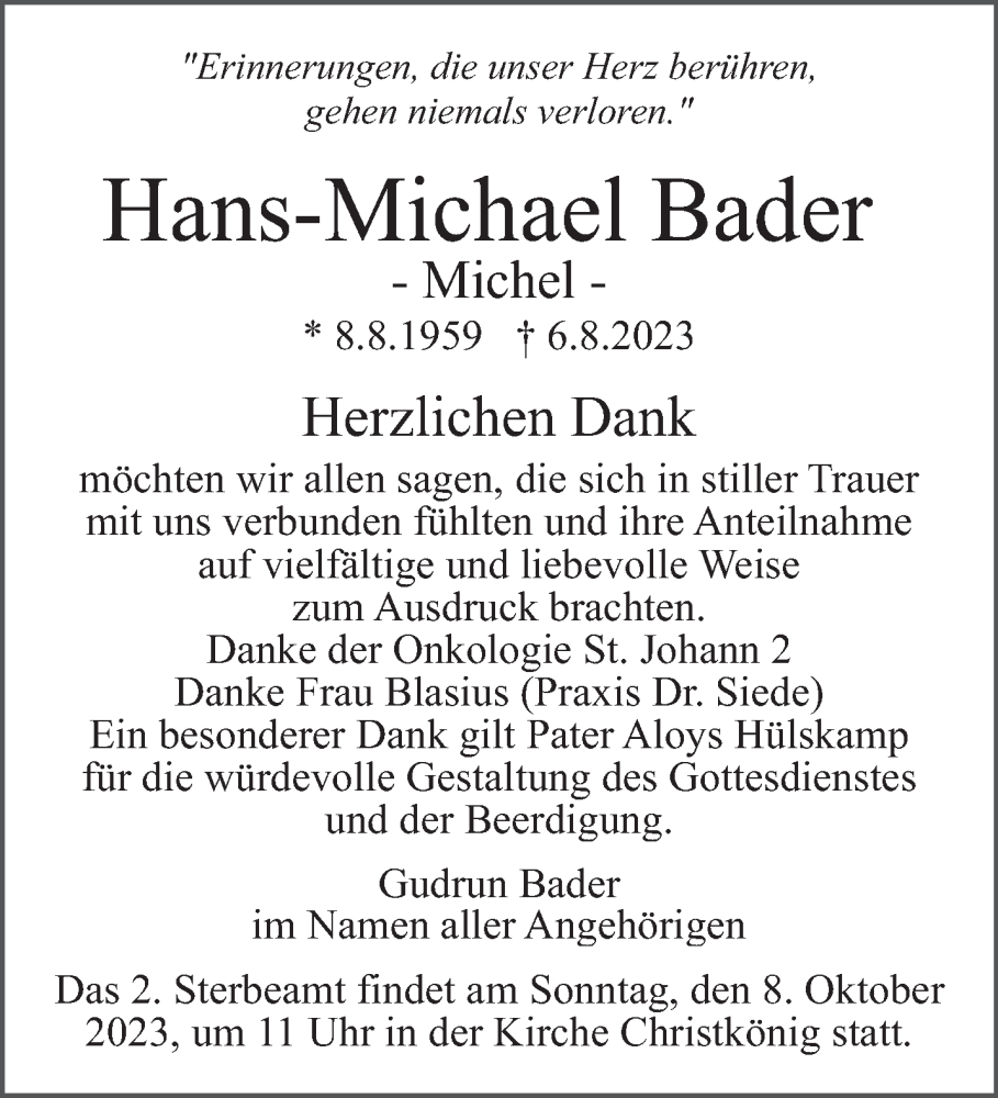 Hier finden Sie alle Traueranzeigen aus der Zeitung, die bisher für Hans-Michael Bader erschienen sind. Weitere Traueranzeigen, die in der Zeitung erscheinen, werden hier ebenfalls aufgelistet