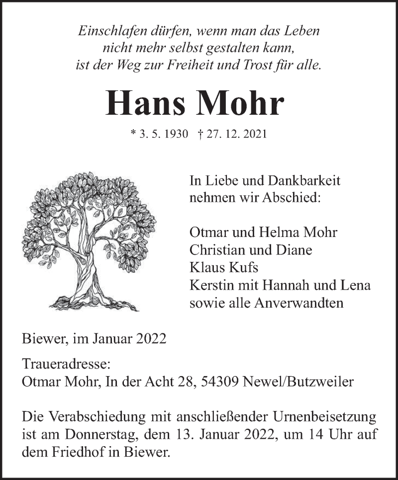 Hier finden Sie alle Traueranzeigen aus der Zeitung, die bisher für Hans Mohr erschienen sind. Weitere Traueranzeigen, die in der Zeitung erscheinen, werden hier ebenfalls aufgelistet