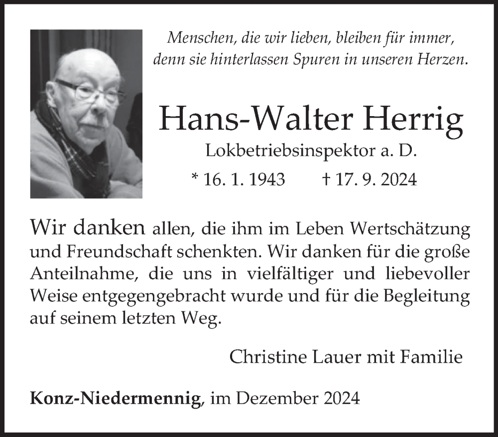 Hier finden Sie alle Traueranzeigen aus der Zeitung, die bisher für Hans-Walter Herrig erschienen sind. Weitere Traueranzeigen, die in der Zeitung erscheinen, werden hier ebenfalls aufgelistet