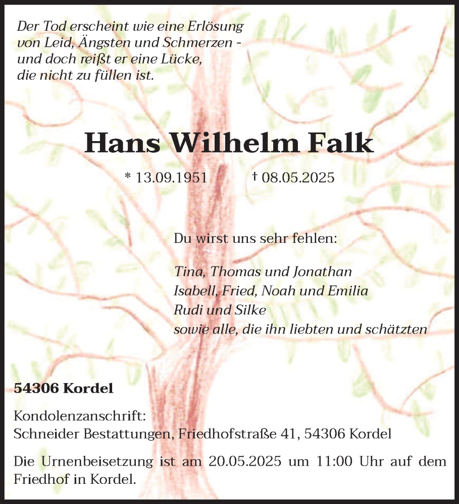 Hier finden Sie alle Traueranzeigen aus der Zeitung, die bisher für Hans Wilhelm Falk erschienen sind. Weitere Traueranzeigen, die in der Zeitung erscheinen, werden hier ebenfalls aufgelistet