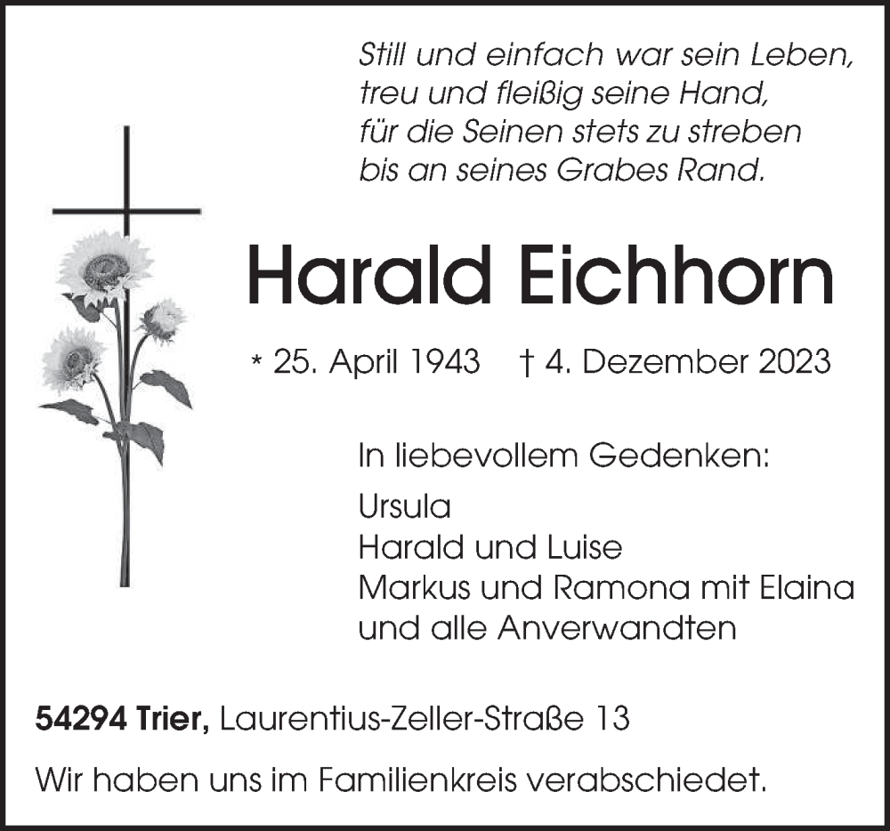 Hier finden Sie alle Traueranzeigen aus der Zeitung, die bisher für Harald Eichhorn erschienen sind. Weitere Traueranzeigen, die in der Zeitung erscheinen, werden hier ebenfalls aufgelistet