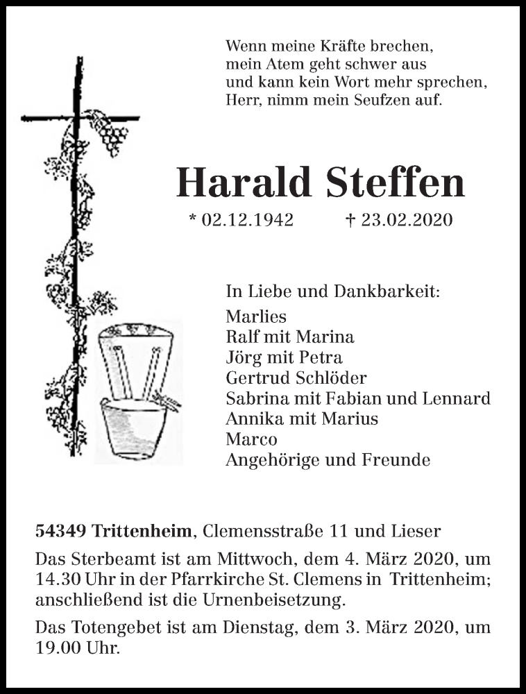 Hier finden Sie alle Traueranzeigen aus der Zeitung, die bisher für Harald Steffen erschienen sind. Weitere Traueranzeigen, die in der Zeitung erscheinen, werden hier ebenfalls aufgelistet