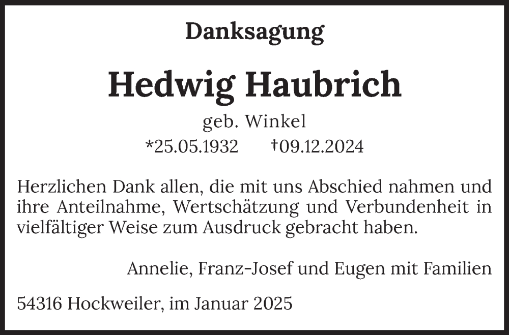 Hier finden Sie alle Traueranzeigen aus der Zeitung, die bisher für Hedwig Haubrich erschienen sind. Weitere Traueranzeigen, die in der Zeitung erscheinen, werden hier ebenfalls aufgelistet