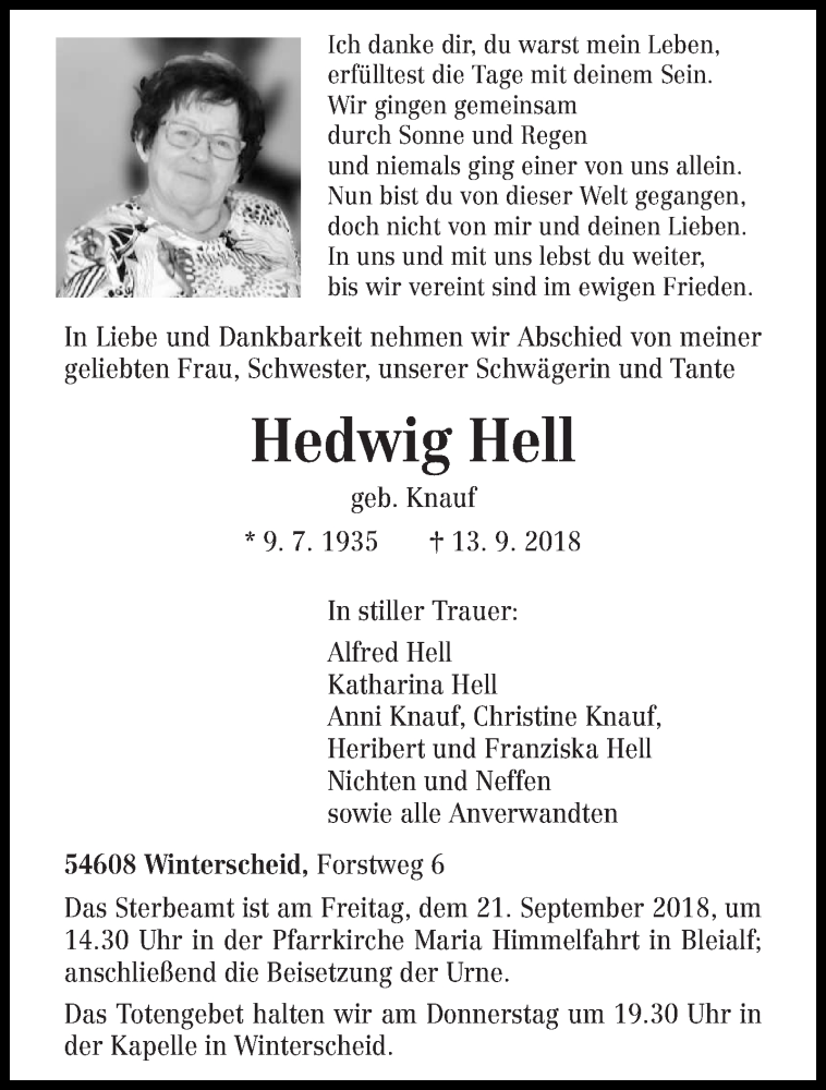 Hier finden Sie alle Traueranzeigen aus der Zeitung, die bisher für Hedwig Hell erschienen sind. Weitere Traueranzeigen, die in der Zeitung erscheinen, werden hier ebenfalls aufgelistet