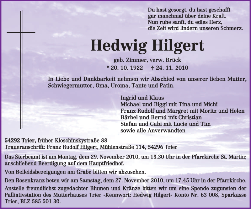 Hier finden Sie alle Traueranzeigen aus der Zeitung, die bisher für Hedwig Hilgert erschienen sind. Weitere Traueranzeigen, die in der Zeitung erscheinen, werden hier ebenfalls aufgelistet