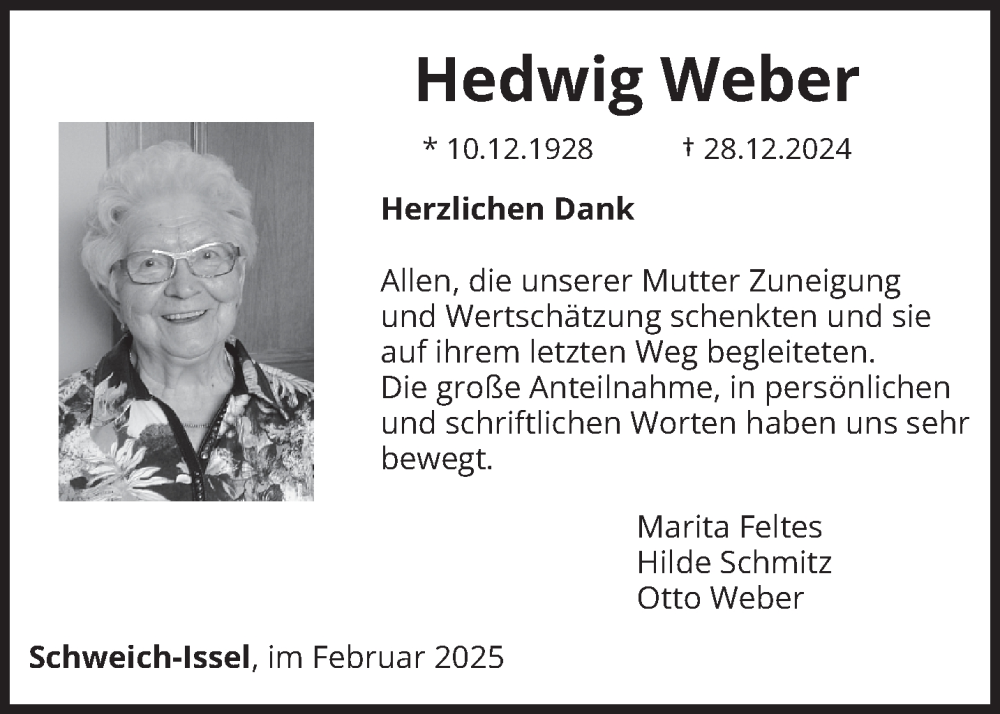 Hier finden Sie alle Traueranzeigen aus der Zeitung, die bisher für Hedwig Weber erschienen sind. Weitere Traueranzeigen, die in der Zeitung erscheinen, werden hier ebenfalls aufgelistet