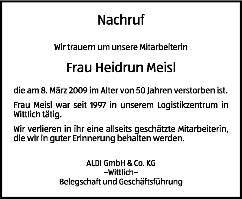 Hier finden Sie alle Traueranzeigen aus der Zeitung, die bisher für Heidrun Meisl erschienen sind. Weitere Traueranzeigen, die in der Zeitung erscheinen, werden hier ebenfalls aufgelistet