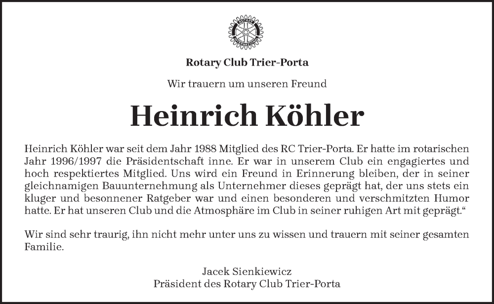 Hier finden Sie alle Traueranzeigen aus der Zeitung, die bisher für Heinrich Köhler erschienen sind. Weitere Traueranzeigen, die in der Zeitung erscheinen, werden hier ebenfalls aufgelistet