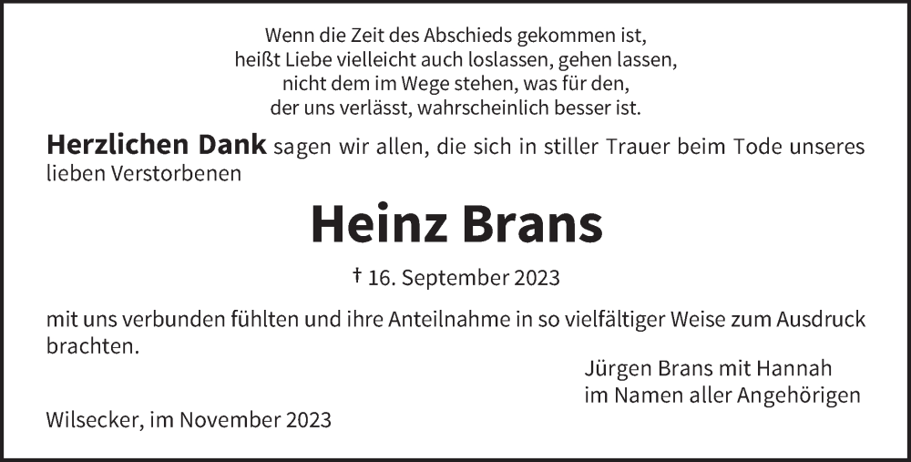Hier finden Sie alle Traueranzeigen aus der Zeitung, die bisher für Heinz Brans erschienen sind. Weitere Traueranzeigen, die in der Zeitung erscheinen, werden hier ebenfalls aufgelistet