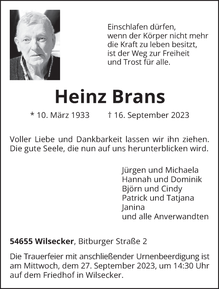Hier finden Sie alle Traueranzeigen aus der Zeitung, die bisher für Heinz Brans erschienen sind. Weitere Traueranzeigen, die in der Zeitung erscheinen, werden hier ebenfalls aufgelistet