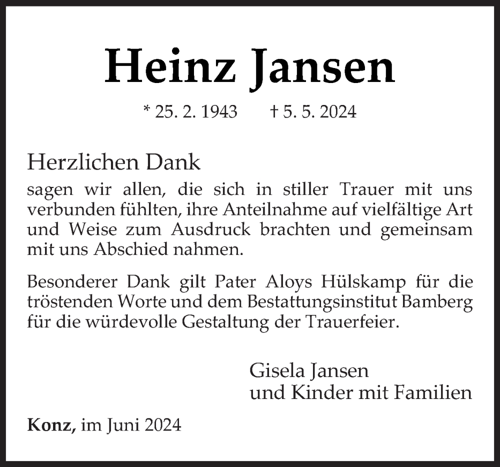 Hier finden Sie alle Traueranzeigen aus der Zeitung, die bisher für Heinz Jansen erschienen sind. Weitere Traueranzeigen, die in der Zeitung erscheinen, werden hier ebenfalls aufgelistet