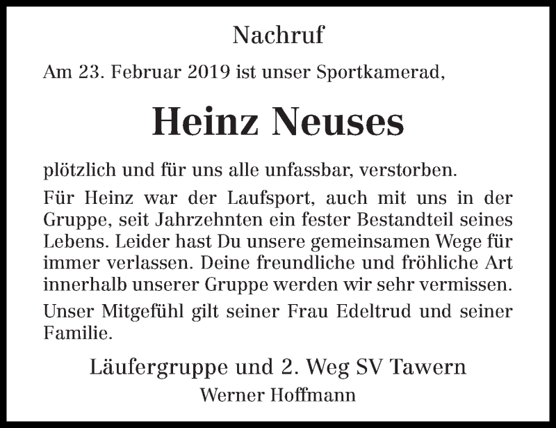 Hier finden Sie alle Traueranzeigen aus der Zeitung, die bisher für Heinz Neuses erschienen sind. Weitere Traueranzeigen, die in der Zeitung erscheinen, werden hier ebenfalls aufgelistet