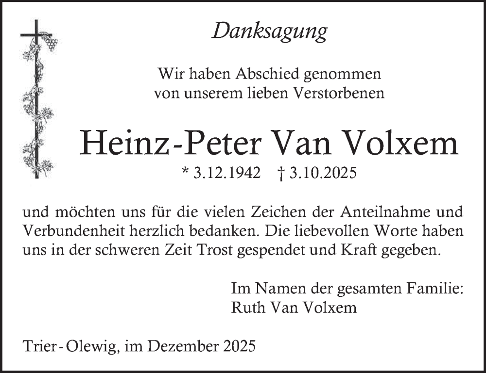 Hier finden Sie alle Traueranzeigen aus der Zeitung, die bisher für Heinz-Peter Van Volxem erschienen sind. Weitere Traueranzeigen, die in der Zeitung erscheinen, werden hier ebenfalls aufgelistet