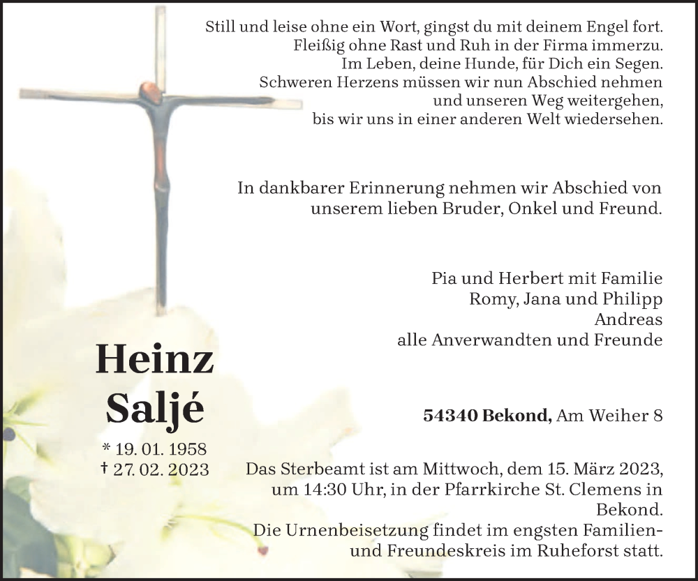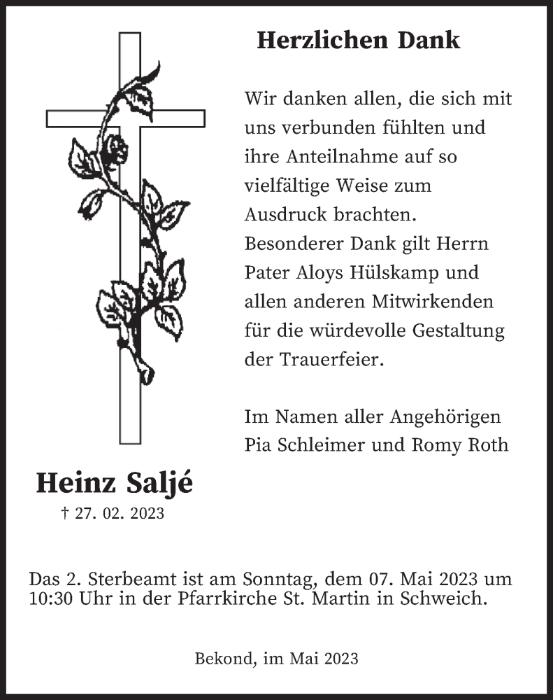 Hier finden Sie alle Traueranzeigen aus der Zeitung, die bisher für Heinz Saljé erschienen sind. Weitere Traueranzeigen, die in der Zeitung erscheinen, werden hier ebenfalls aufgelistet