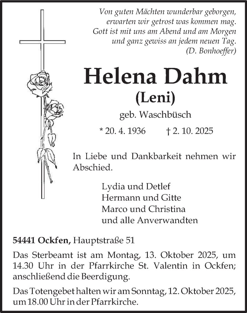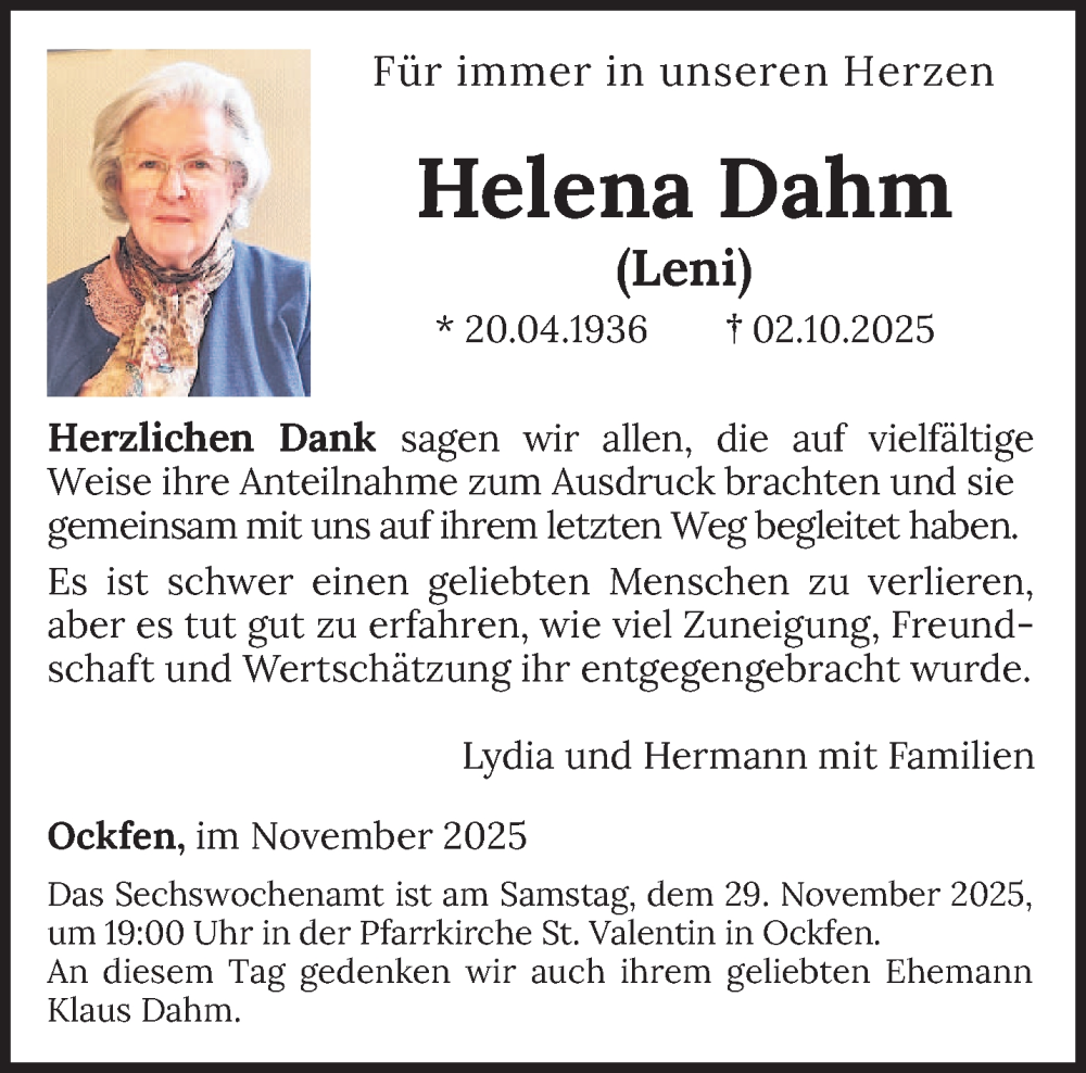 Hier finden Sie alle Traueranzeigen aus der Zeitung, die bisher für Helena Dahm erschienen sind. Weitere Traueranzeigen, die in der Zeitung erscheinen, werden hier ebenfalls aufgelistet