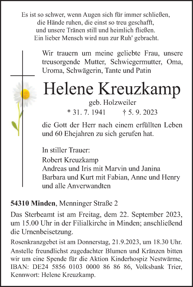 Hier finden Sie alle Traueranzeigen aus der Zeitung, die bisher für Helene Kreuzkamp erschienen sind. Weitere Traueranzeigen, die in der Zeitung erscheinen, werden hier ebenfalls aufgelistet