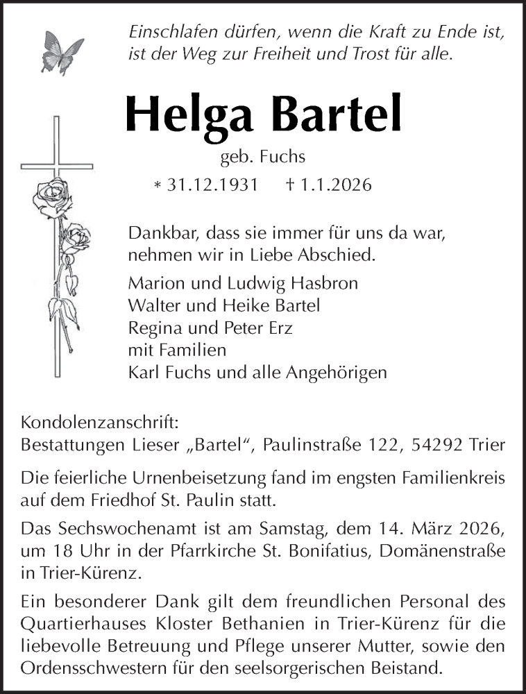 Hier finden Sie alle Traueranzeigen aus der Zeitung, die bisher für Helga Bartel erschienen sind. Weitere Traueranzeigen, die in der Zeitung erscheinen, werden hier ebenfalls aufgelistet