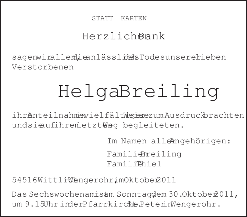 Hier finden Sie alle Traueranzeigen aus der Zeitung, die bisher für Helga Breiling erschienen sind. Weitere Traueranzeigen, die in der Zeitung erscheinen, werden hier ebenfalls aufgelistet